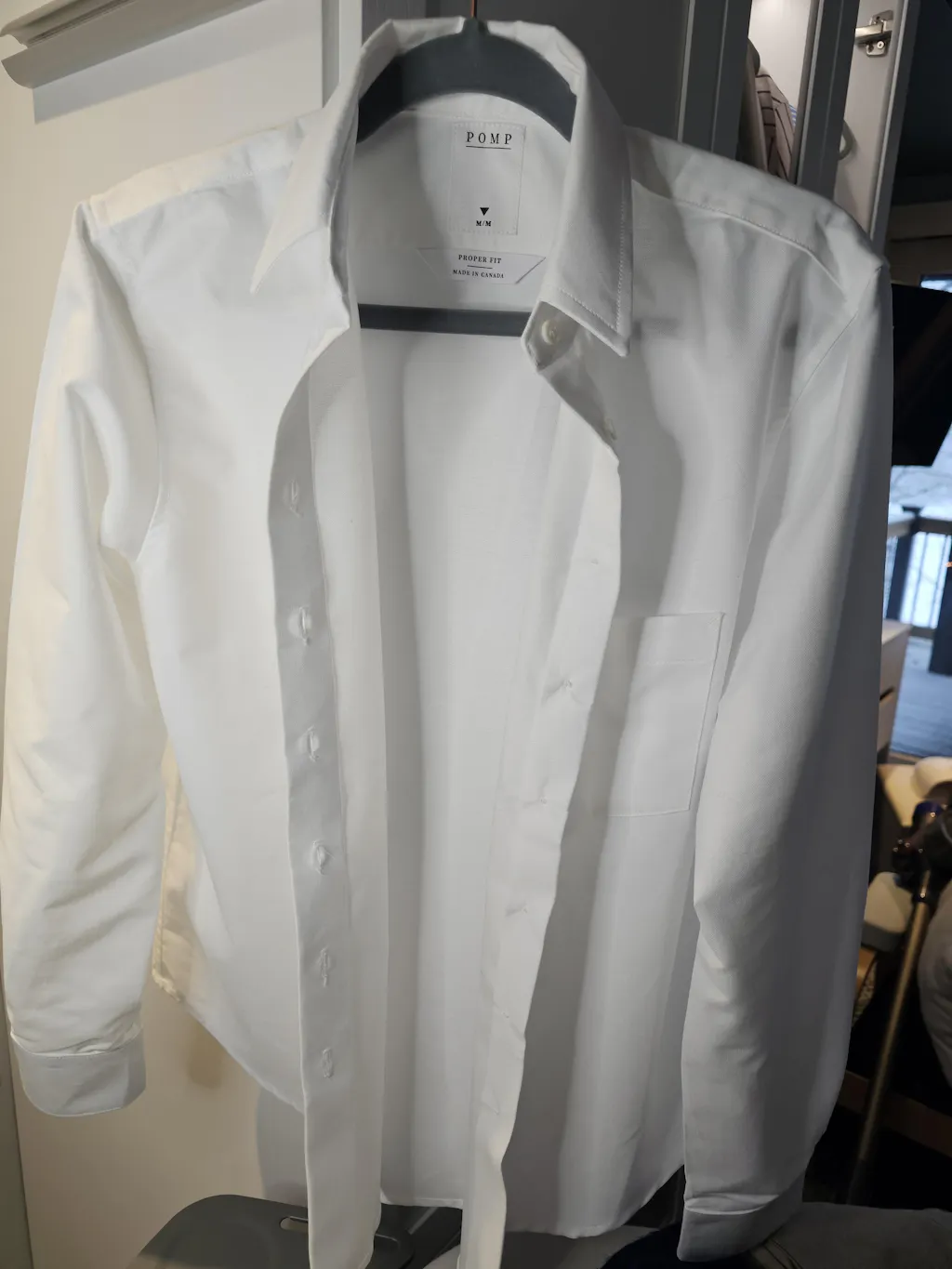 100% Cotton, 4.4 oz, True White Oxford weave Fabric. Fibres sourced from USA & Egypt, milled in Portugal.